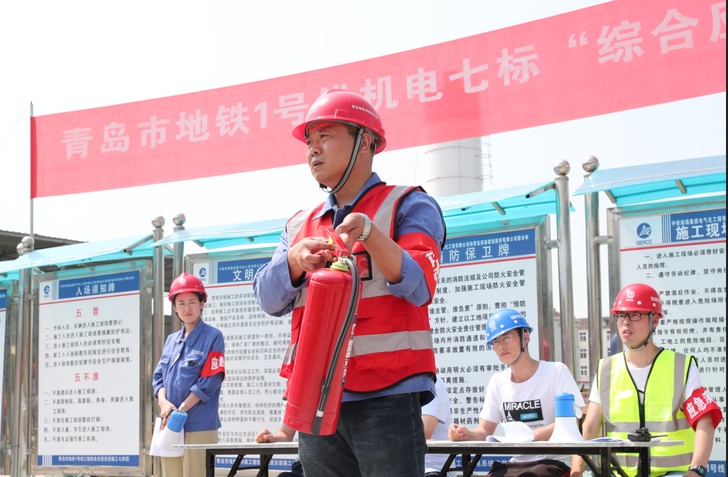 為扎實(shí)開(kāi)展2019年“安全生產(chǎn)月”活動(dòng),牢固樹(shù)立“生命至上,安全生產(chǎn)”理念,全面提升安全生產(chǎn)事故應(yīng)急救援處置能力,2019年6月14日下午,我公司聯(lián)合中鐵四局地鐵項(xiàng)目部在青島市地鐵1號(hào)線(xiàn)工程機(jī)電系統(tǒng)施工七標(biāo)段遵義路站站區(qū)開(kāi)展了一次以“防風(fēng)險(xiǎn) 除隱患 遏事故”為主題的安全生產(chǎn)事故應(yīng)急救援綜合演練活動(dòng),公司黨委書(shū)記、常務(wù)副總經(jīng)理張衛(wèi)財(cái)出席活動(dòng),安環(huán)部主任馬世革、中鐵四局、監(jiān)理公司、各分公司負(fù)責(zé)安全生產(chǎn)的副經(jīng)理、專(zhuān)職安全員及安環(huán)部全體人員共計(jì)80余人到現(xiàn)場(chǎng)觀(guān)摩演練。中鐵四局青島地鐵1號(hào)線(xiàn)機(jī)電七標(biāo)項(xiàng)目經(jīng)理劉洋擔(dān)任演練總指揮。公司商務(wù)經(jīng)理姜曉紅擔(dān)任主持人。